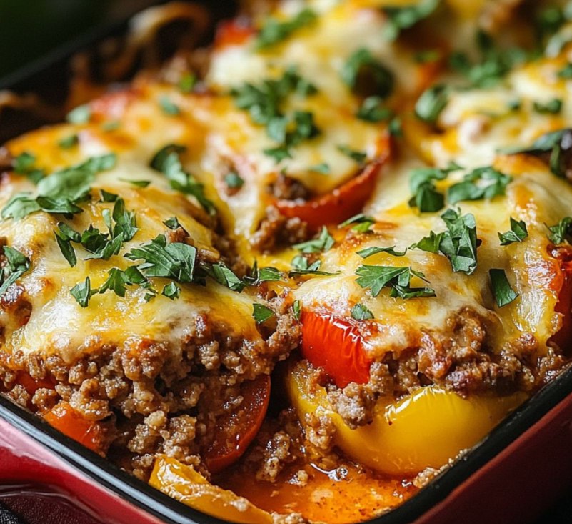 "En matig och tröstande rätt! Lager av mjuk paprika, smakrik köttfärs och krämigt ris, allt sammanbundet av en kryddig tomatsås och täckt med smält ost. En riktigt tillfredsställande delikatess!"