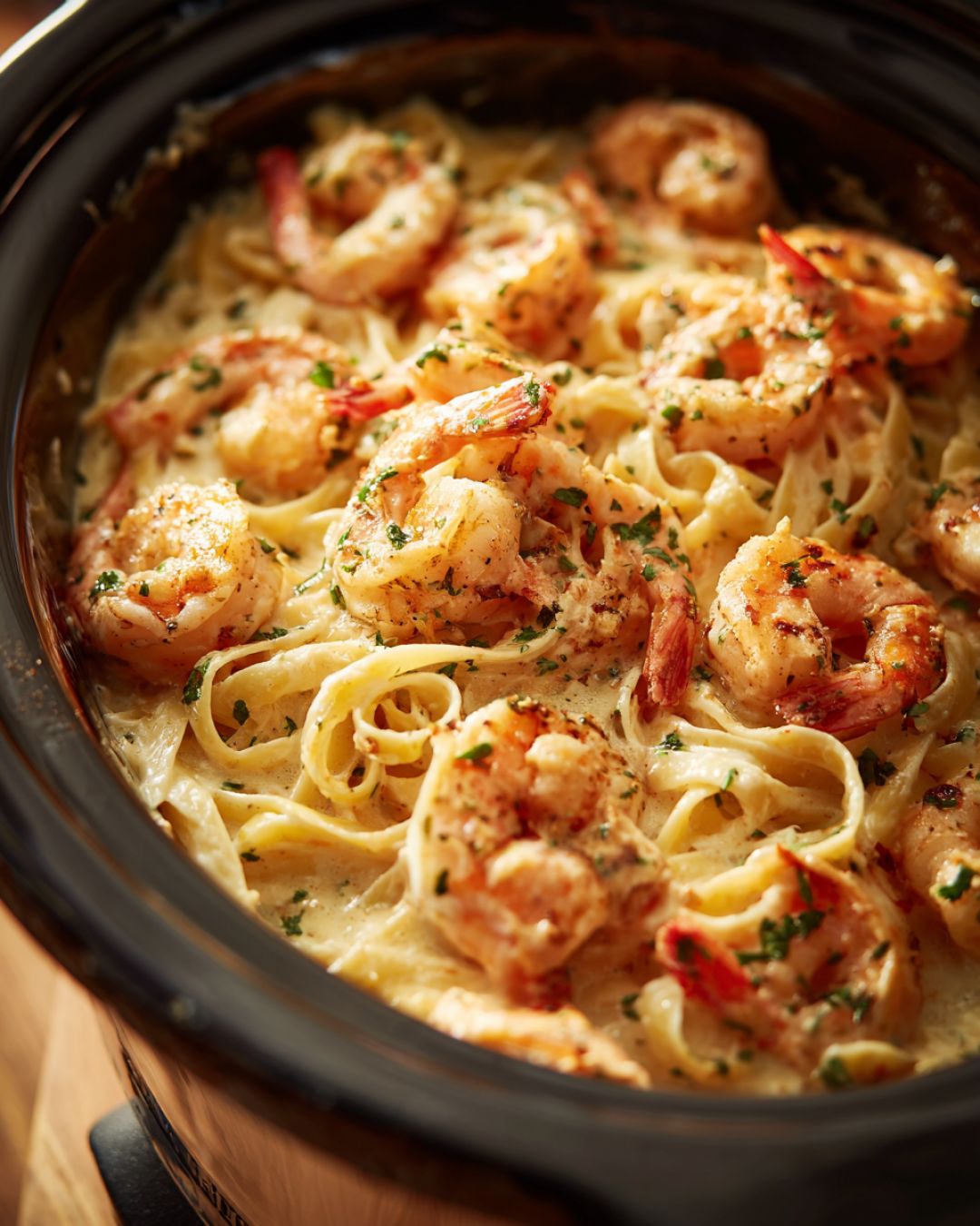 Alfredo tar mig alltid tillbaka till första gången jag såg den på ett kyrkligt knytkalas i slutet av 80-talet, när allt med grädde och pasta kändes riktigt fint här ute på landet. På den tiden pratade vi förstås inte så mycket om ”Alfredo”; vi kallade det bara ”den där rika pastan med vit sås” och skickade runt fatet två gånger. Den här räkalfredon i slow cooker är min nedbantade version med fyra ingredienser för dagar när du är trött, vädret är grått och du ändå vill ha något som känns lite speciellt. Att använda frysta räkor och sås på burk skulle kanske få min mormor att höja på ögonbrynen, men hon hade uppskattat hur det gör att du kan ställa fram en tröstande, restaurangliknande rätt utan att behöva stå vid en het spis. Det är ett recept att stoppa i bakfickan för stressiga veckor, barnbarnsbesök eller de kvällar när du vill ha en varm, krämig skål pasta som smakar som om du lagt ner mycket mer arbete än du faktiskt har gjort.