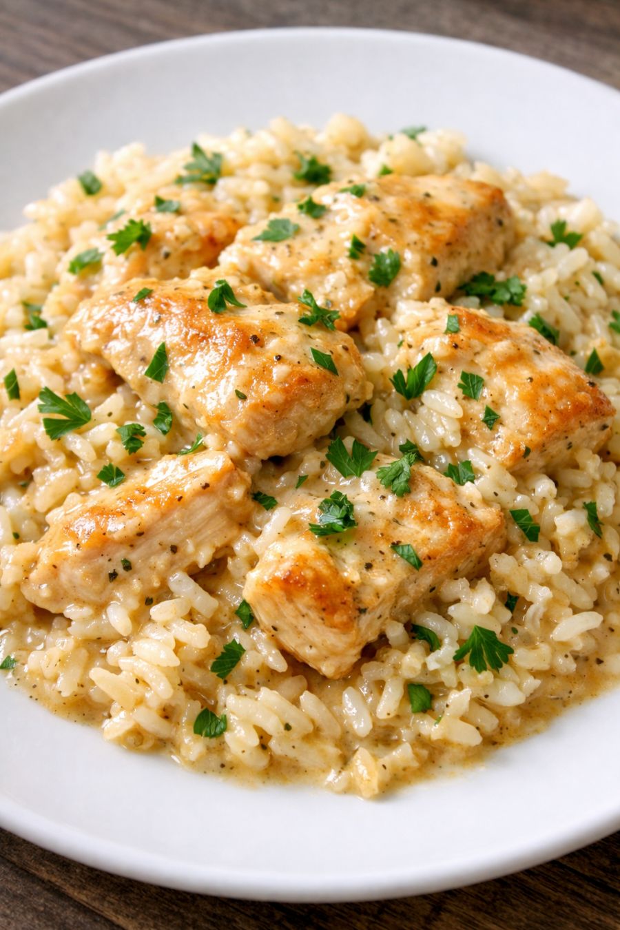 Den här kyckling-och-ris-rätten i slow cooker med fyra ingredienser är en sådan där mysig, okomplicerad middag som känns som en kram i en skål. Den är inspirerad av den klassiska mellanvästern-favoriten ”kyckling- och risgratäng” som så många av oss växte upp med – enkla skafferivaror, inget märkvärdigt, bara varma, välbekanta smaker som får hela huset att dofta inbjudande. Du slänger ner allt i slow cookern på morgonen, och till middagen har du mör kyckling och fluffigt långkornigt ris som har tillagats tillsammans i en krämig, tröstande bas. Det är den sortens måltid du lagar på stressiga skoldagar, kalla söndagar eller när du bara vill ha något som alla runt bordet – både barn och vuxna – glatt äter utan övertalning.